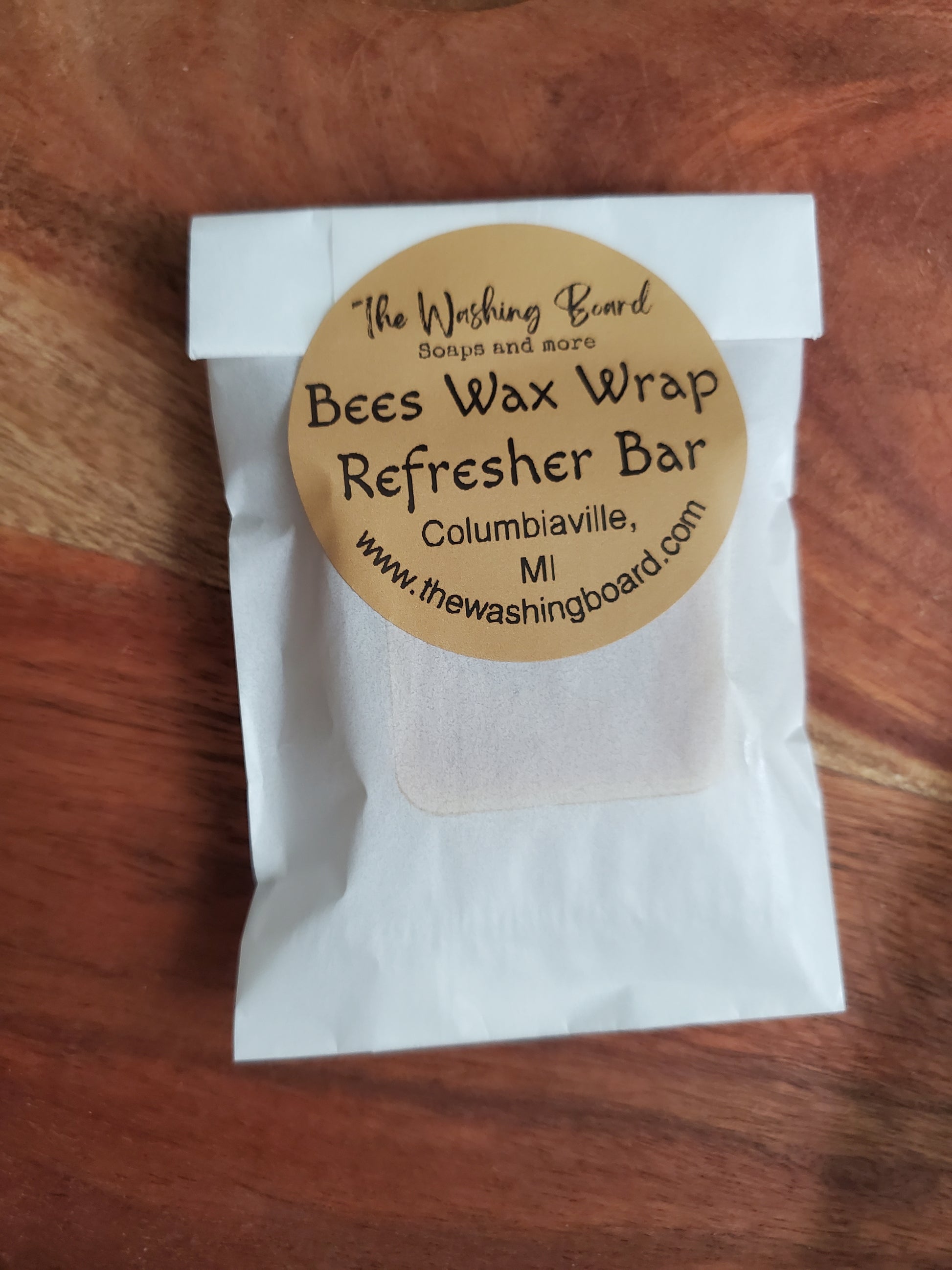 Small bars of the wax blend we use to make our Bees Wax Wraps, to refresh your wrap when it starts losing its own. Depending on how much you use your wrap, refresh about every 6 to 12 months as needed. Approximately 1/2 oz per bar.