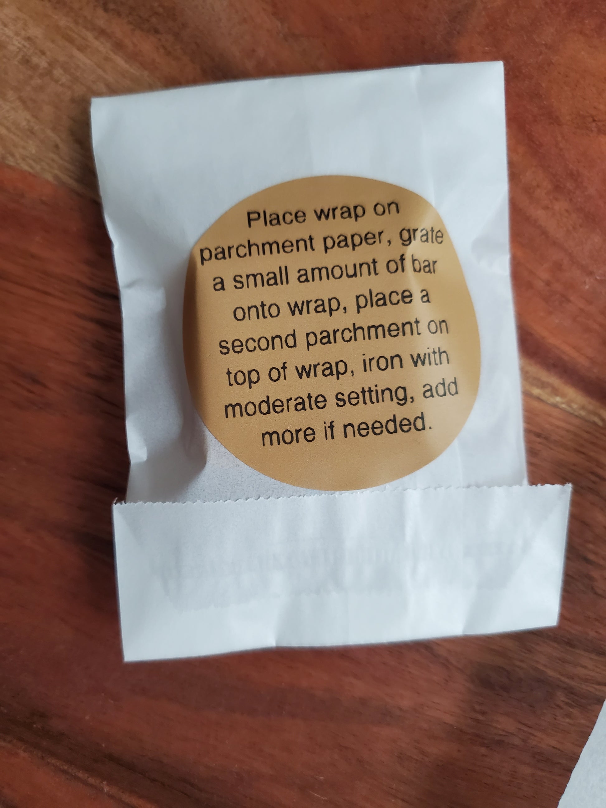 To use: place wrap on a sheet of parchment paper, grate a SMALL AMOUNT of the Refresher Bar over wrap, cover with a second piece of parchment. Iron on dry, moderate heat setting. It's easiest to add more if needed.