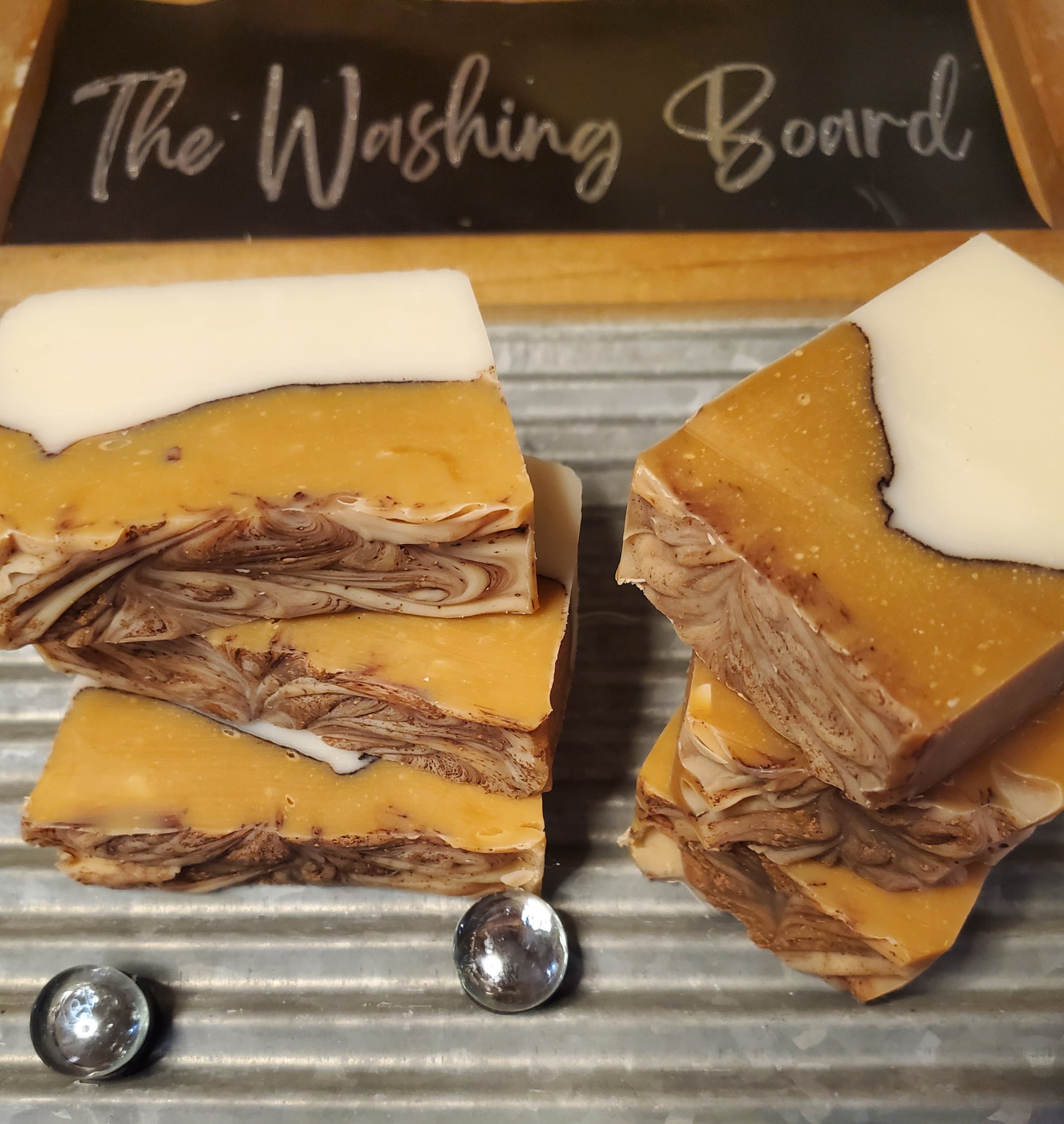 Ingredients: olive oil. coconut oil, shea butter, castor oil, sodium hydroxide, distilled water, sunflower oil, raw local (Michigan) honey, cocoa powder (pencil line).