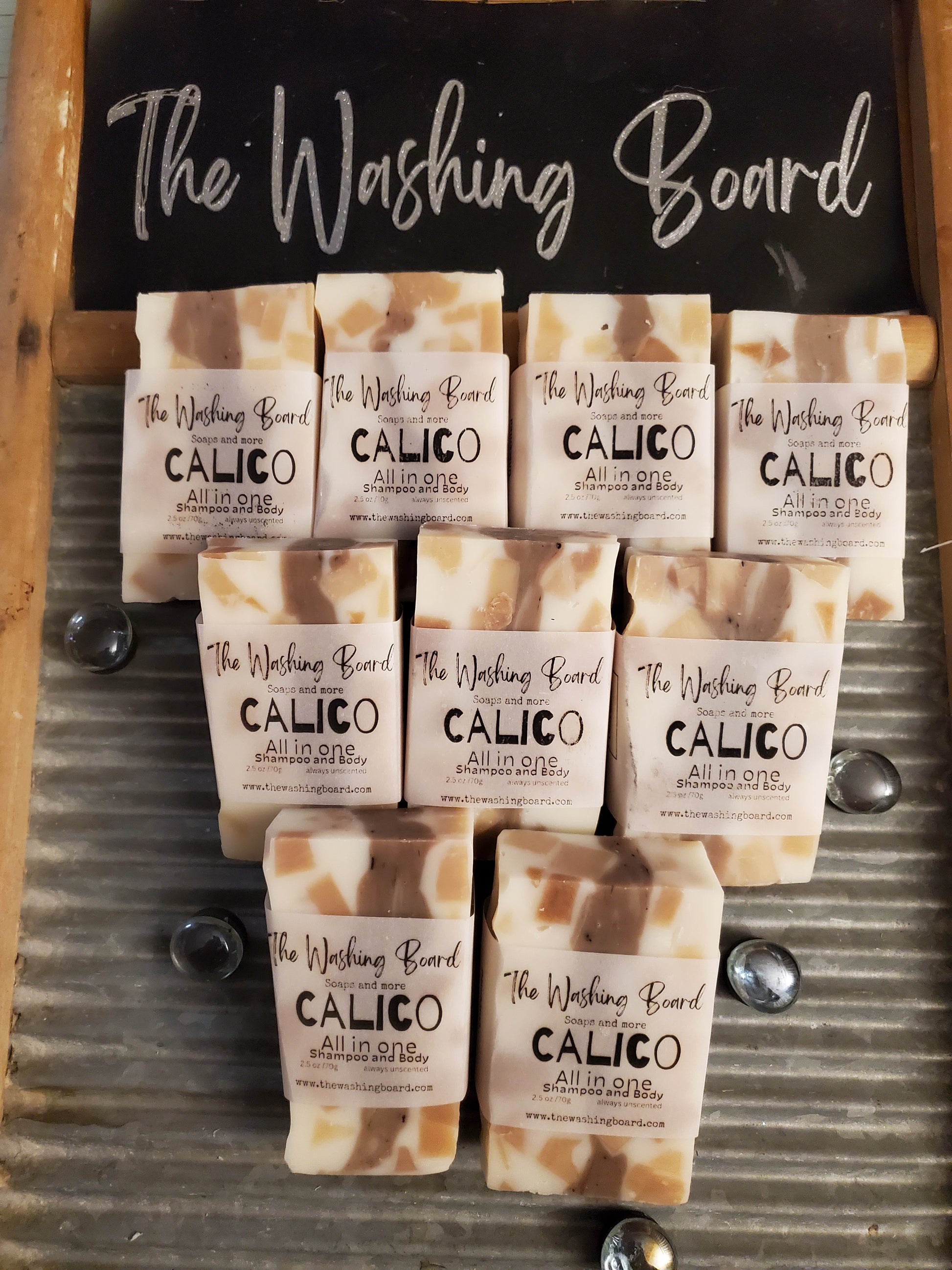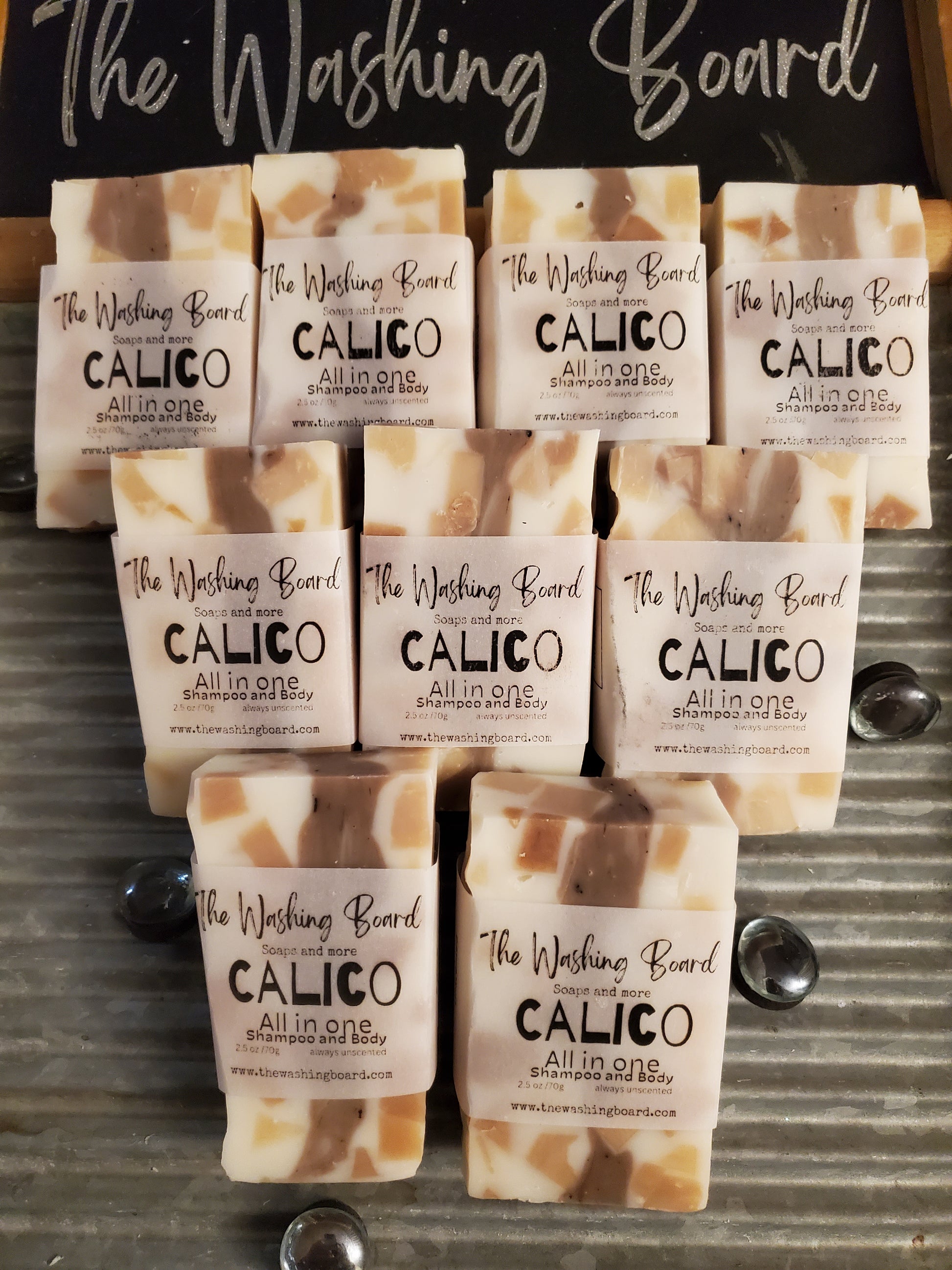 Calico All in One bar, great for body or hair! Simple, no nonsense ,all in one use, guys tend to love it, but because it is unscented, girls can too.