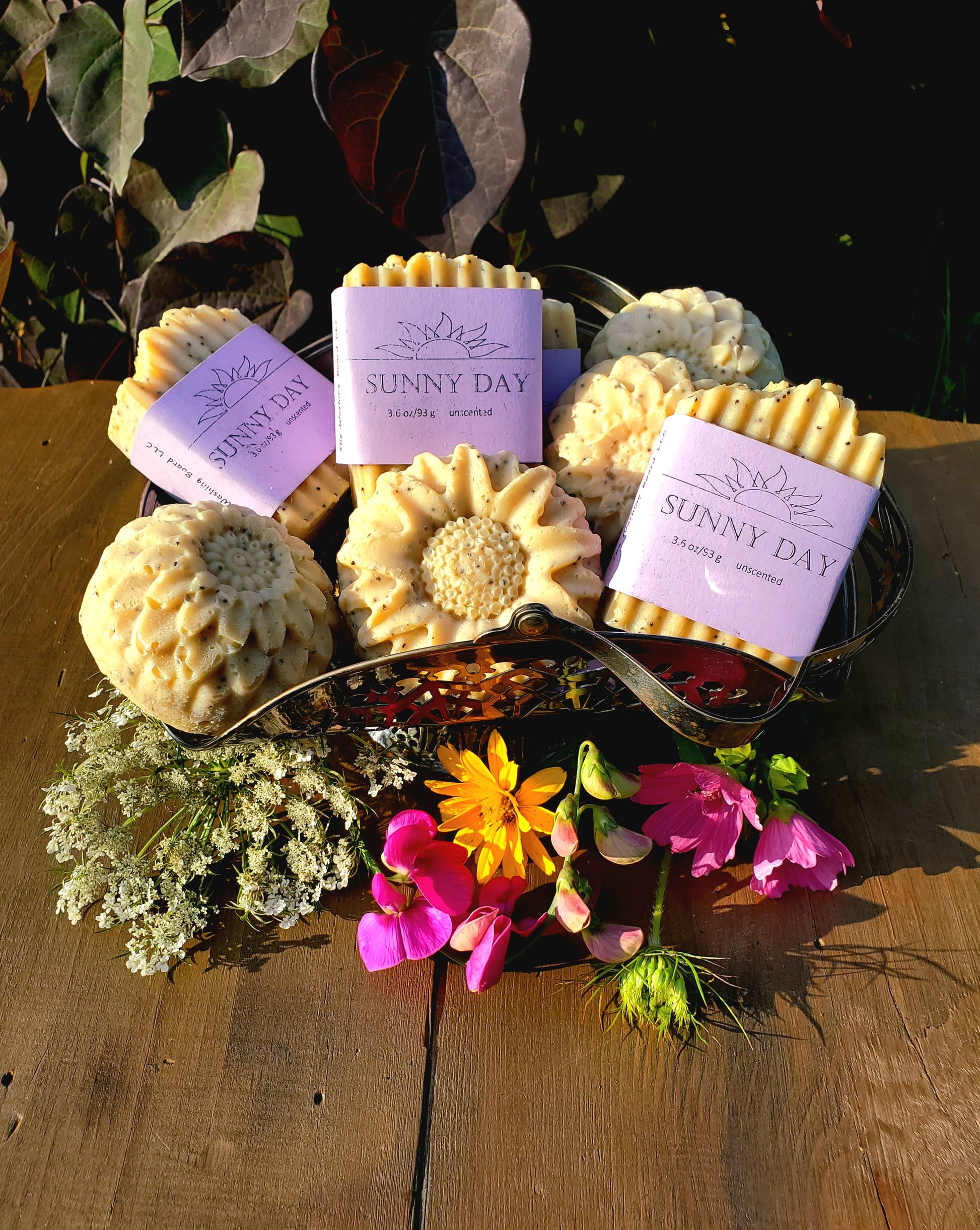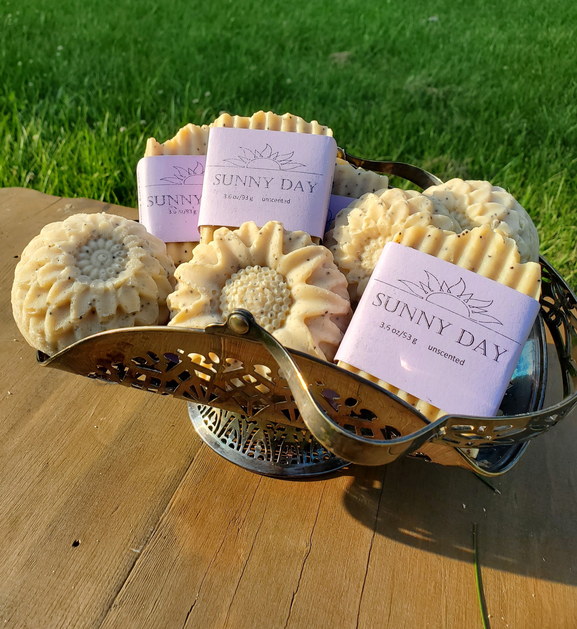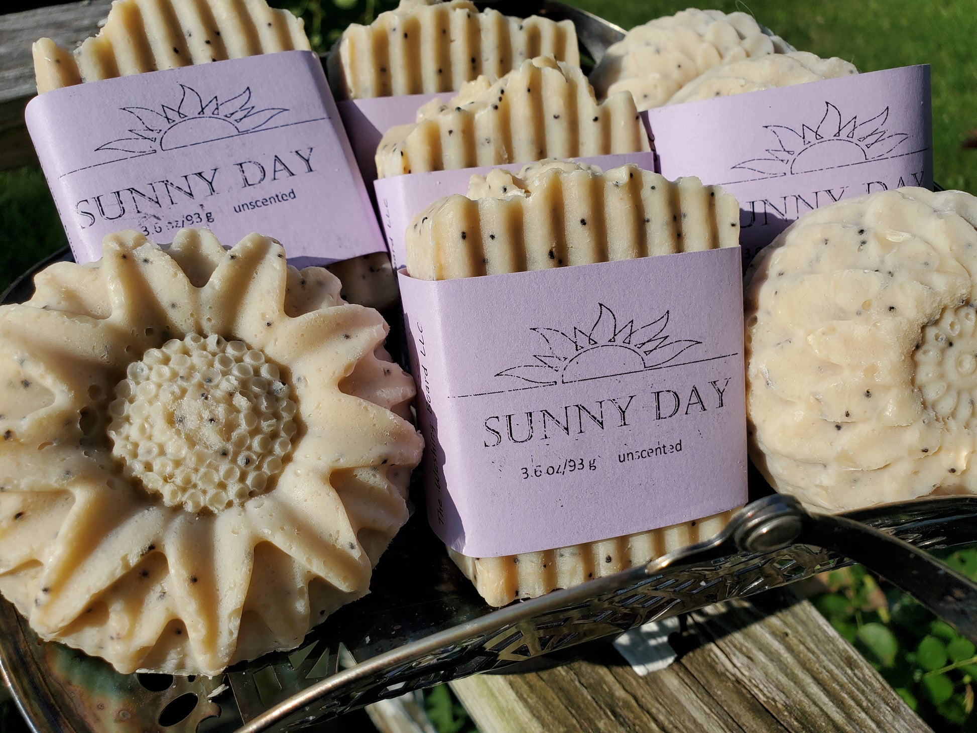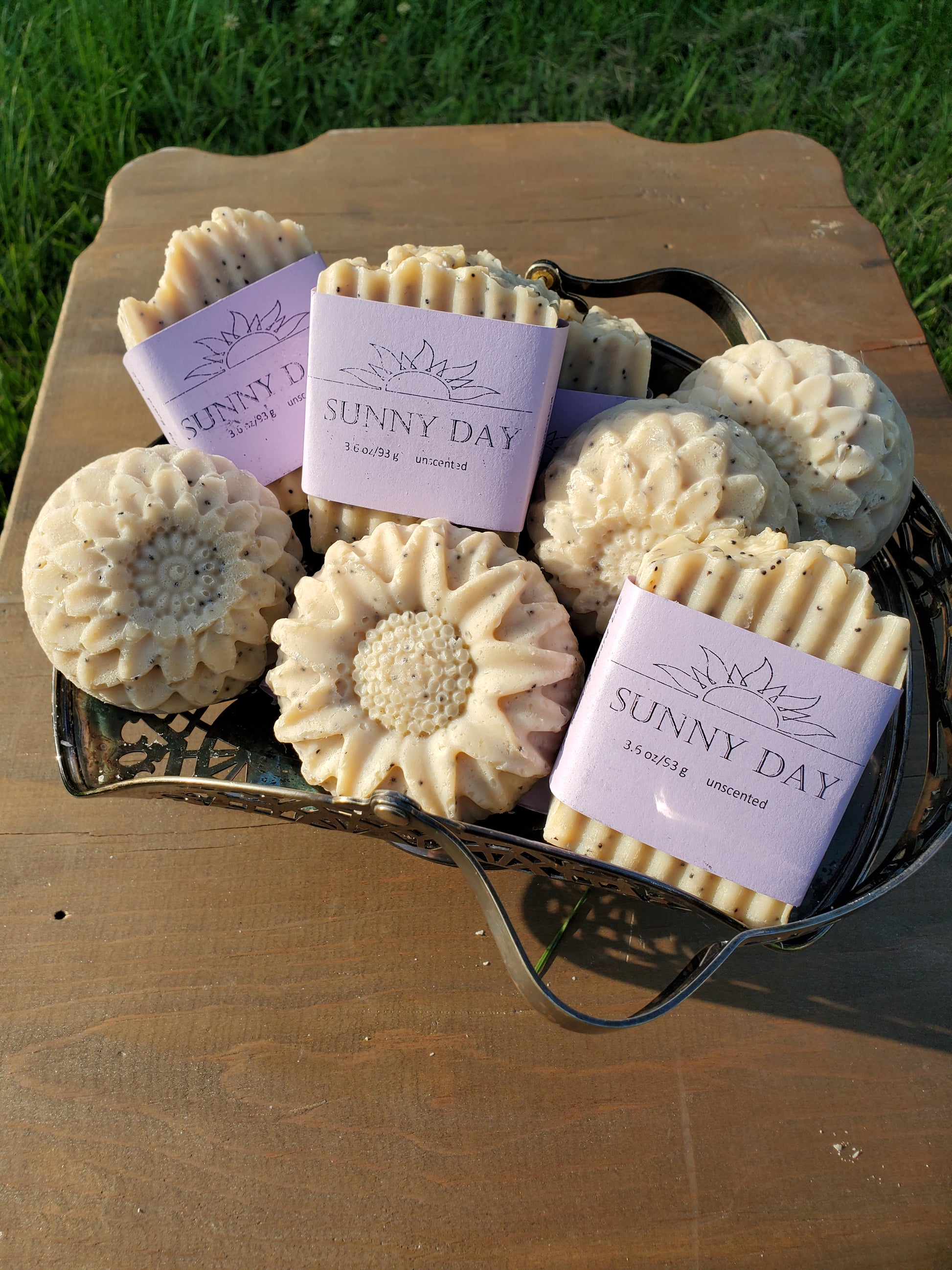 Brazilian yellow clay make the sunshine-y color of this no coconut soap and poppy seeds for the "sun kissed freckles". Double butter richness with shea and cocoa butter. Choose from a slice or a flower version.