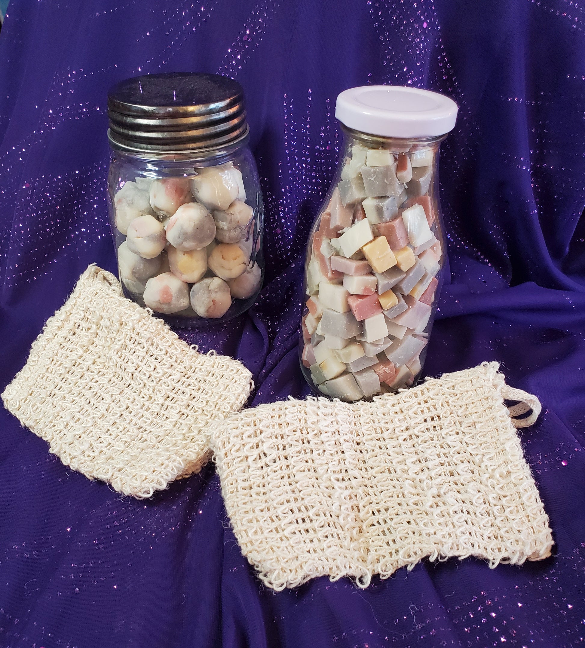 To use the Jar with soap balls or Milk Bottle with soap cubes, open jar, pour some soap bits into the bag and cinch the top of the bag closed, wet bag and wash. When you're at the end of the soap in the bag refill from the jar or bottle! If you've used all the soap bits you can still reuse the bag with more soap.