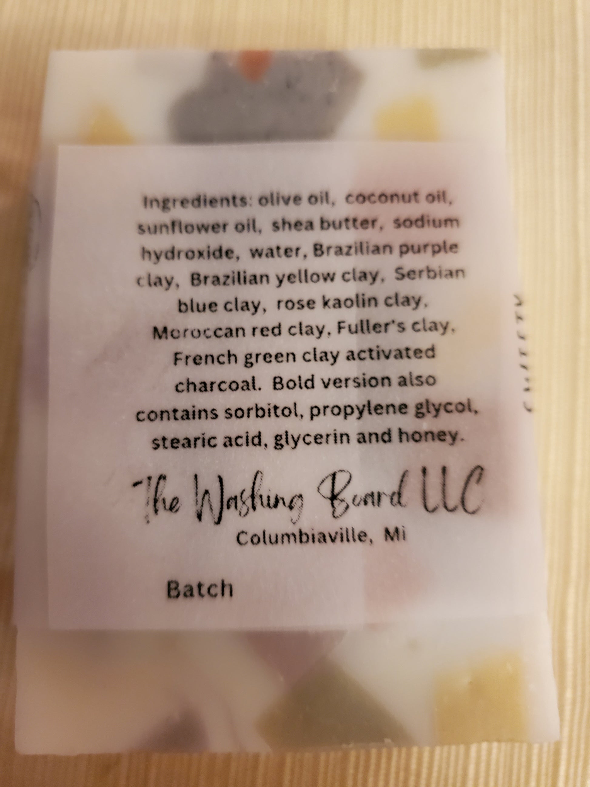 Ingredients: olive oil, coconut oil, shea butter, sunflower oil, sodium hydroxide, water, Brazilian purple clay, Brazilian yellow clay, Moroccan red clay, Serbian blue clay, French green clay, rose kaolin clay, Fullers clay, activated charcoal. Bold version also contains sorbitol, propylene glycol, stearic acid, glycerin and honey.