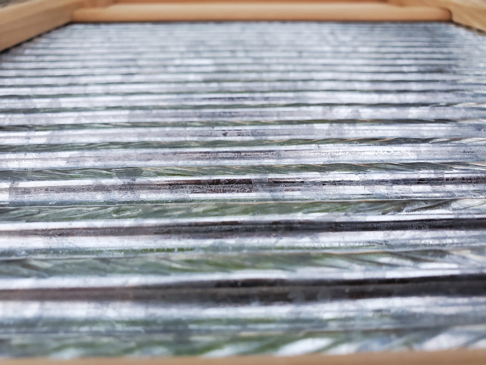 Brand new double sided stainless steel and poplar wash board. We had these specially made for us by the Columbus Wash Board Factory. One side has extra tall ridges with a braided top for extra dirt and heavy duty fabrics, the opposite side has smaller ridges for more delicate fabrics. They can also be used for decor and has a magnetic surface. 24" h x 12.5" w x 3" d