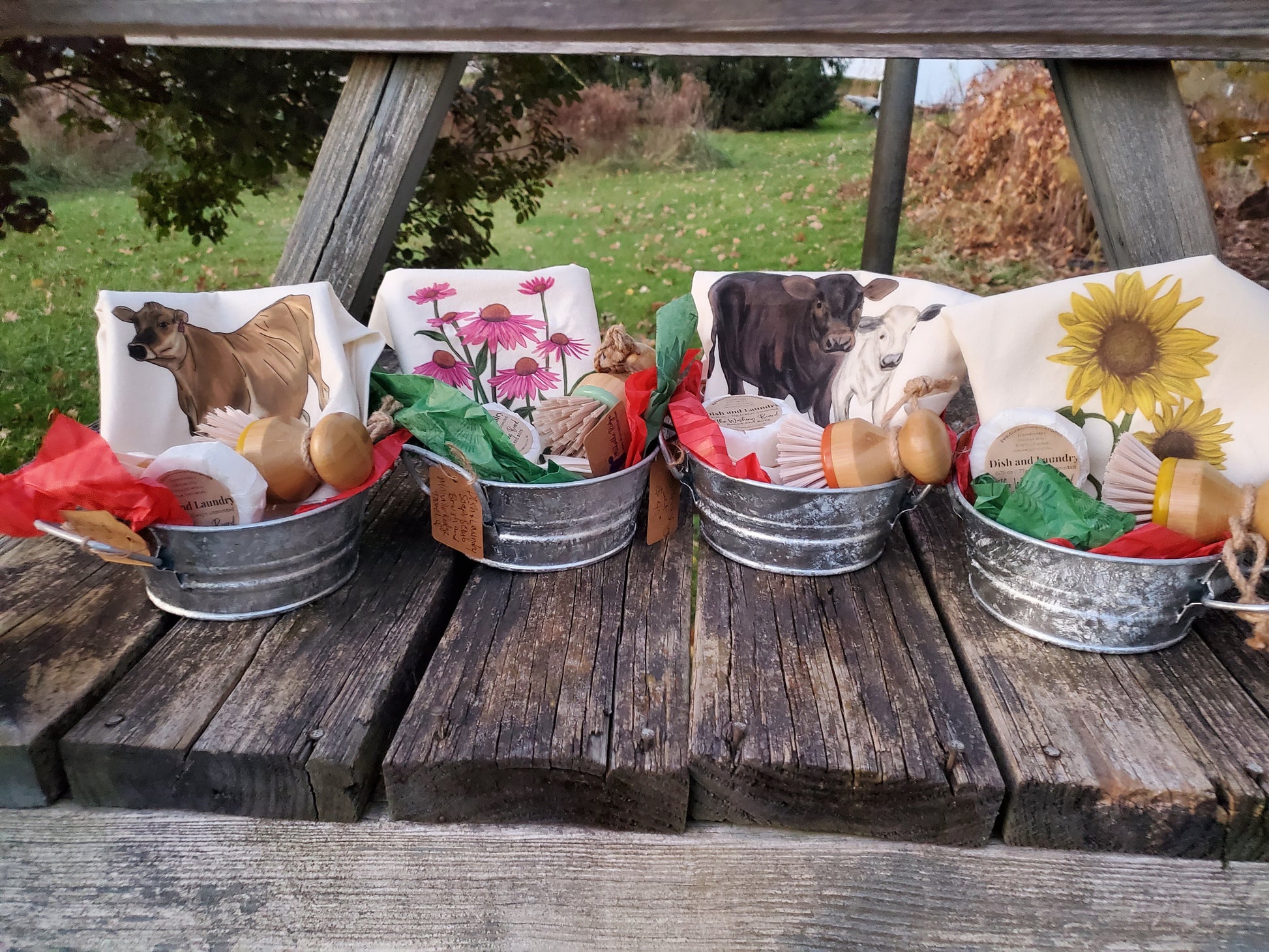 A GORGEOUS Turkish Cotton towel with a hand drawn design from our friends at Millville Ridge Farm and matching sticker paired with our Dish and Laundry Puck and Scrubby Brush, in the cutest little bucket, truly a masterpiece!